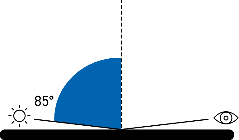 為了提高低光澤度的分辨率,使用 85° 的掠射角來測量表面。對于以 60° 測量時尺寸小于 10GU 的表面,建議使用此角度。